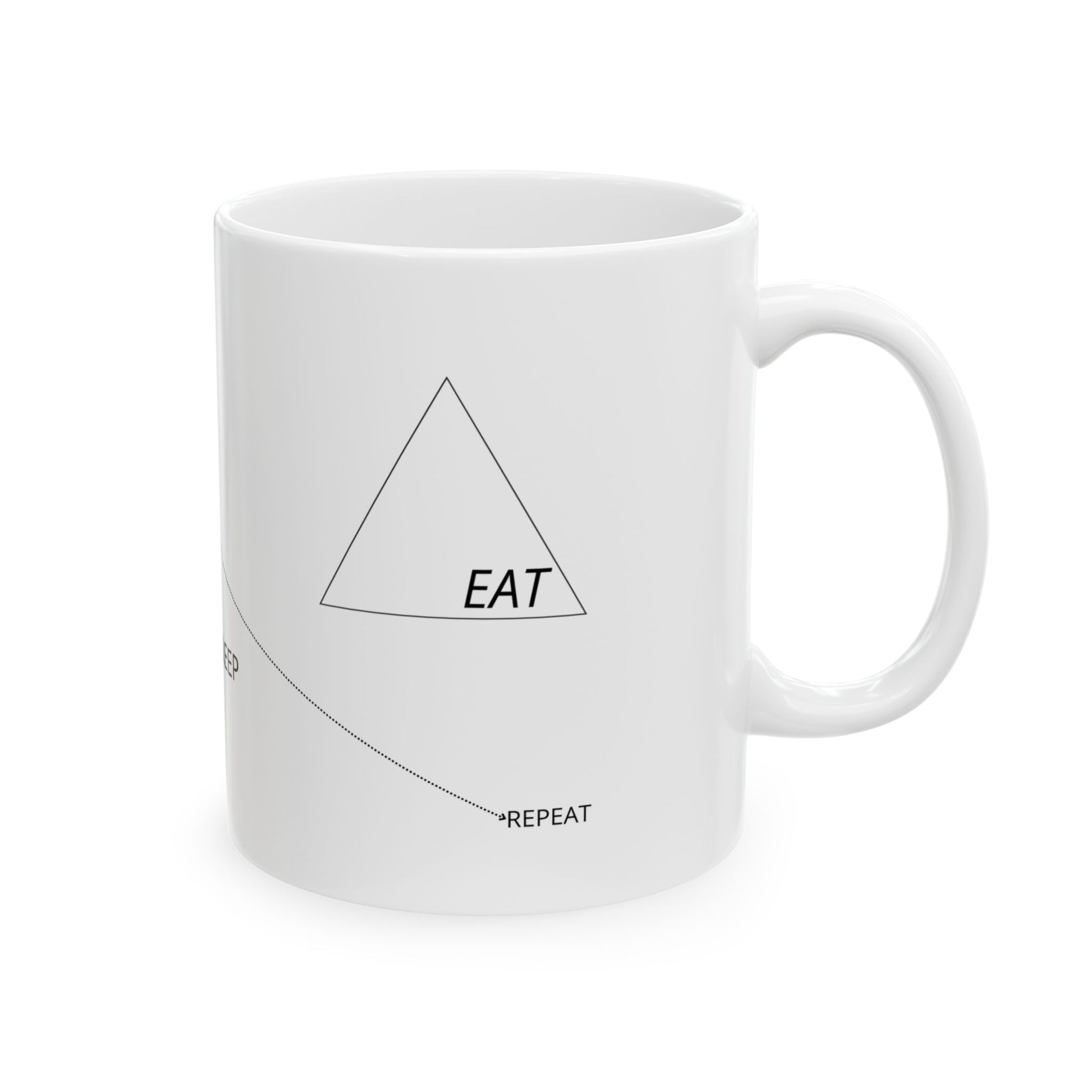 "Eat, Hydrate, Hug Your Pet, Repeat" text, Blue, White Ceramic Mug, 11oz